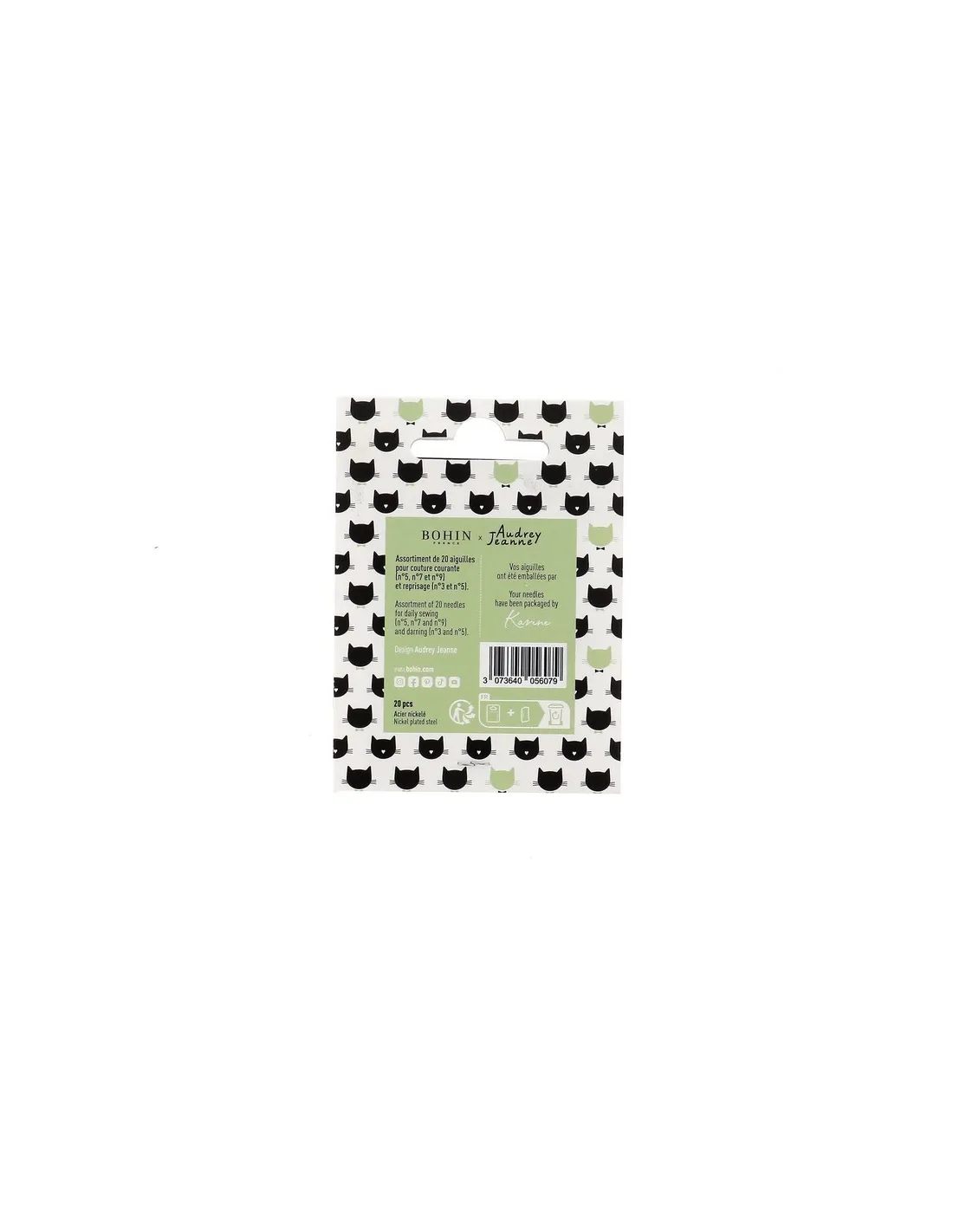 Surtido de 20 agujas Colección Bohin x Audrey Jeanne. Marca: Bohin. Inspírate en el mundo felino de la talentosa ilustradora Audrey Jeanne con este encantador estuche de agujas de Bohin. Repleto de su arte delicado y humorístico, este carnet está pensado tanto para costureras creativas como para amantes de los gatos.