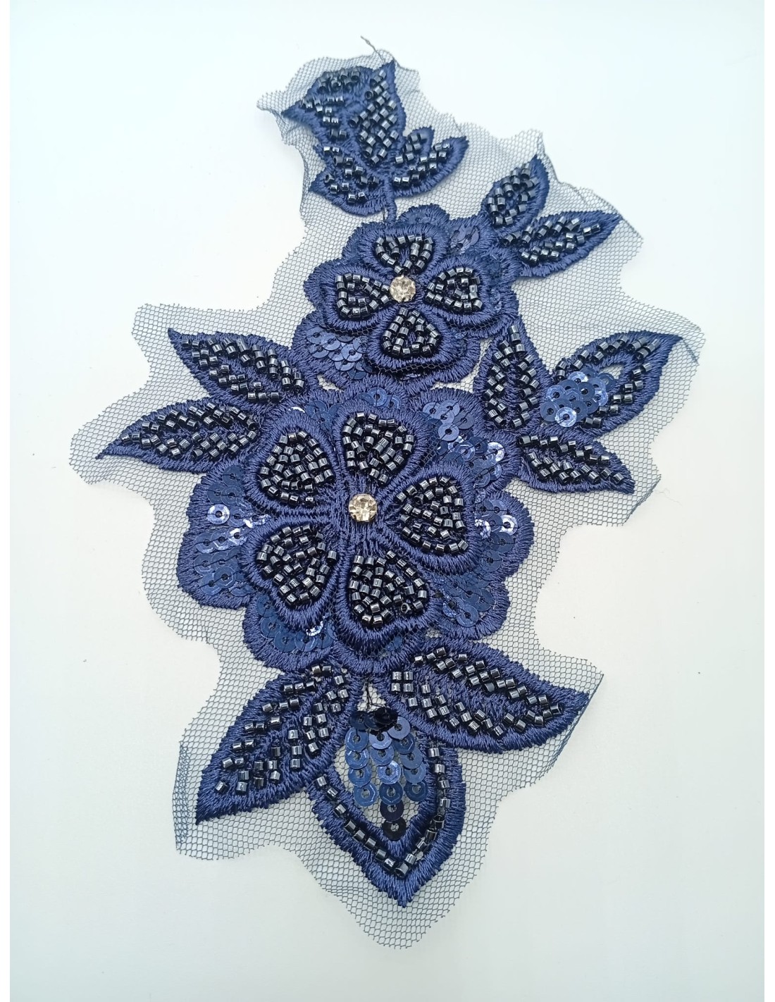 Aplicación de tul con bordados de abalorios y brillos con motivos florales . Mide aproximadamente 12 cm por 21 cm. ideales para customizar cualquier jersey, vestido o prenda.