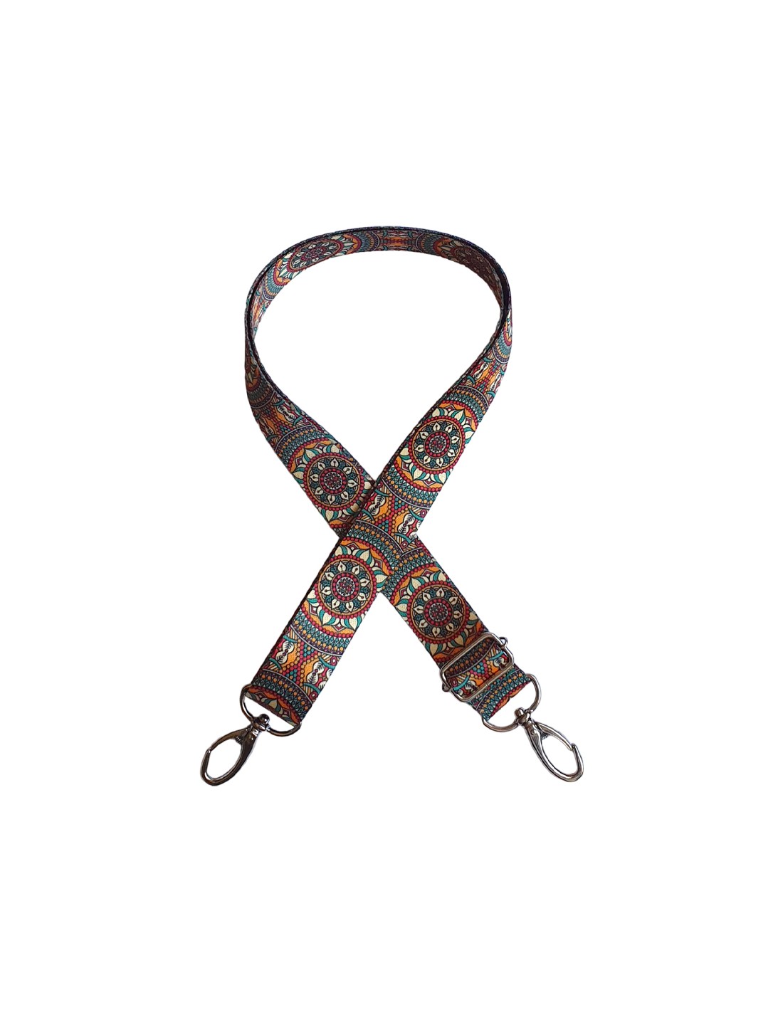 Asa de bolso con cinta de 3 centímetros de ancho estampada con dibujos de mandala donde predominan colores anaranjados. viene preparada con la fornitura en tonos plateados para ya enganchar en el bolso : dos mosquetones y un regulador. La cinta llega a la medida de 1,35 cm de largo
