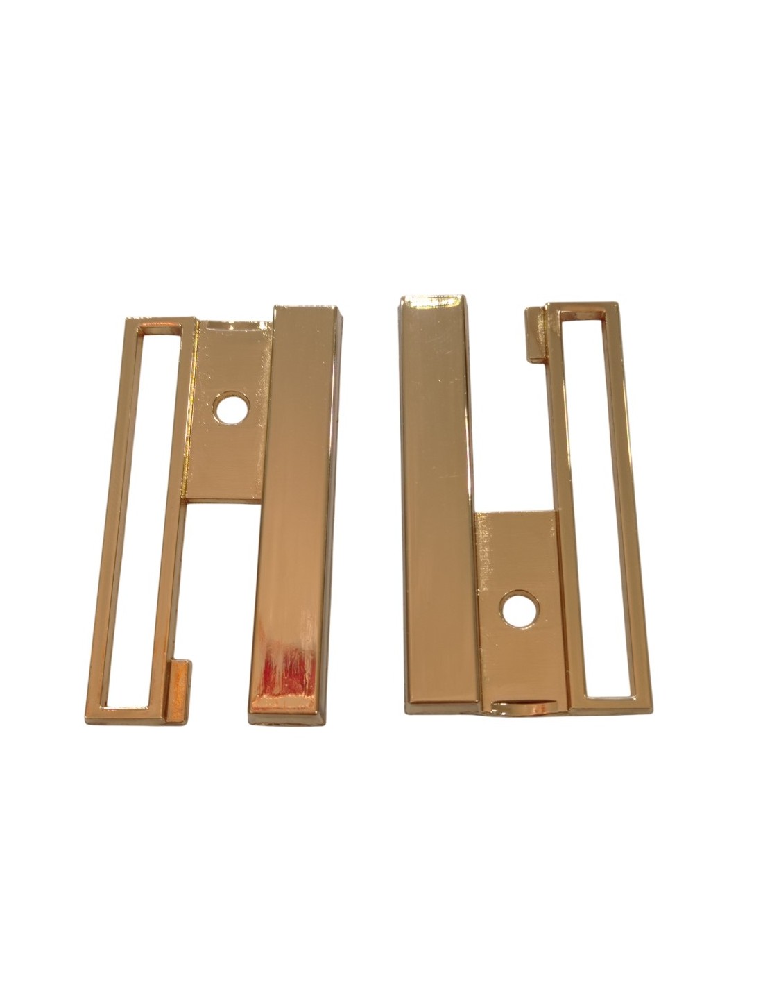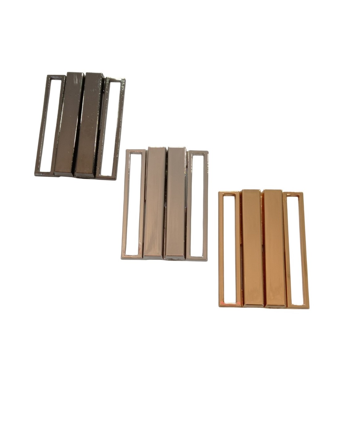 Hebilla plana ideal para cinturones de goma o tela con un paso de 50 mm. Engancha una sobre la otra. Medidas de ancho y alto aproximadamente: 39mmx53mm. Se vende por unidad. Disponible en tres tonos metal: pavonado, dorado y plateado.
