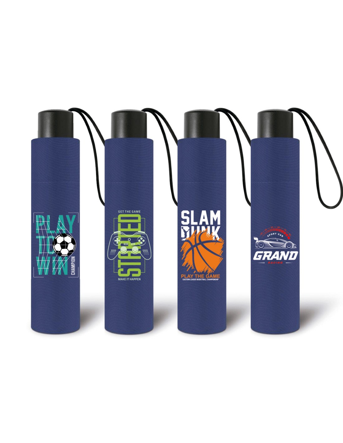 Paraguas plegable de cadete de la colección Cuatrogotas con apertura manual. Un paraguas juvenil  con varillas  antiviento . Un práctico paraguas plegable de color azul con 4 diseños diferentes con dos estampaciones en cada paraguas y con una funda a conjunto. Color del producto: azul. Paraguas de 8 varillas de 54 cm. Diámetro: 98 cm. Tamaño: 24 cm de longitud plegado. Tipo de apertura: manual